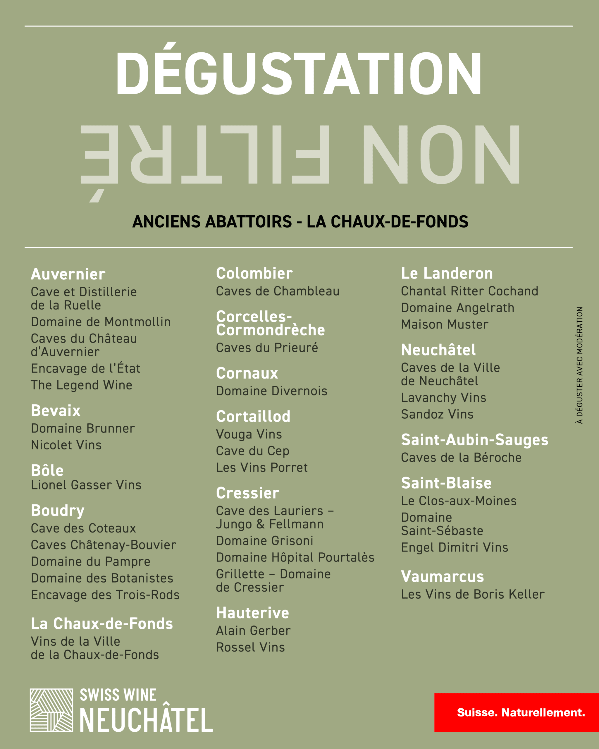 Ce vin typiquement neuchâtelois est élaboré à base de Chasselas. Sa fermentation est complètement achevée lorsqu’au début du mois de janvier, il est mis en bouteille sans filtration finale. Le Neuchâtel Ǝ̗ꓤꓕꓶIᖵ NON étant le premier vin de l’année, il représente, pour le connaisseur impatient, le reflet du millésime qui vient d’être récolté.